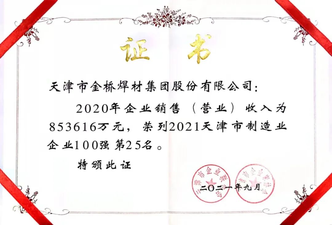 2021年金橋集團再次入選天津企業(yè)100強 天津制造業(yè)企業(yè)100強
