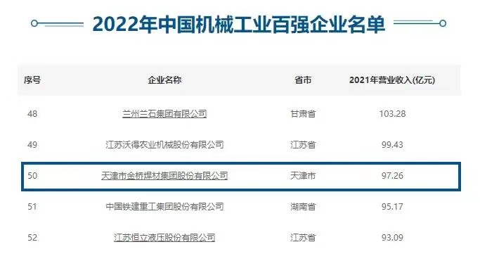 入圍前50! 天津金橋焊材集團(tuán)上榜機(jī)械工程百?gòu)?qiáng)名單
